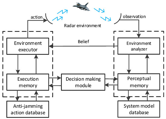 We designed a cognitive radar anti-jamming intelligent decision-making system. The POMDP model is used to model the random behavior of adaptively selecting anti-jamming actions when the radar is jammed to achieve intelligent confrontation. For uncertain factors, the POMDP model can be described by probability. The advantage of the model is that it can quantitatively describe the radar’s ability to identify the working state of the jammer, and then provide support for the radar’s autonomous anti-jamming action decision-making. Figure 1 depicts the structure of the radar intelligent anti-jamming system.