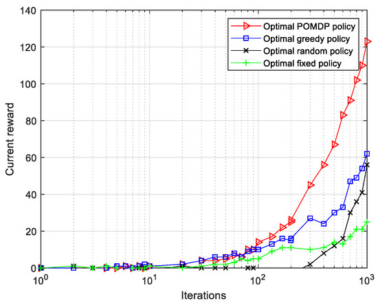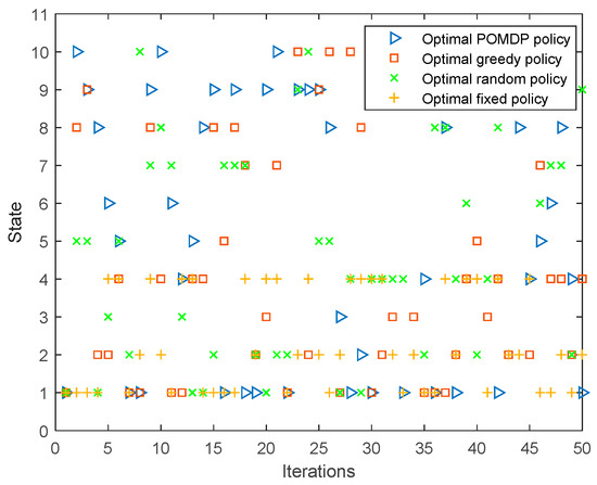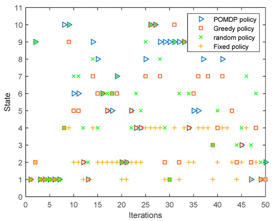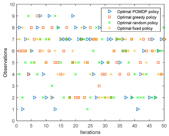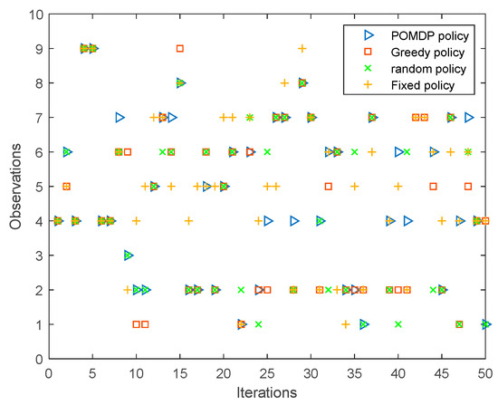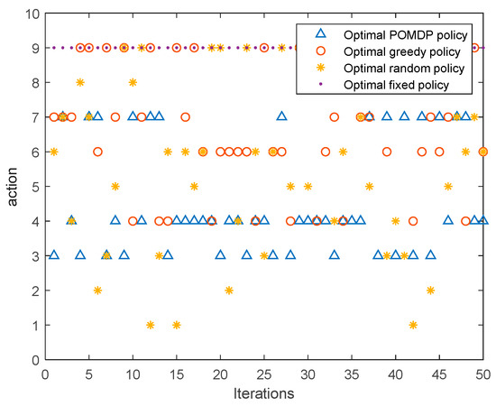The greedy policy, also labeled as “myopic” policy, determines a state-specific action to the state that has the maximum likelihood of transmitting the current observation. The random policy maps the belief state to a random action, and each action has the same opportunity to be chosen. A fixed policy means that the radar always takes an identical anti-jamming action regardless of how the jamming state changes. The constant false alarm processing is used as a fixed anti-jamming measure for the radar. Figure 3 and Figure 4 shows the update of jamming states and observations under the four policies, and Figure 5 shows an anti-jamming action taken by the radar at each time step. The horizontal axis is the iteration time step from 0 to 50 times and the vertical axis is the sequence number of the state, observations, and action, respectively. The results intuitively reflect the dynamic game confrontation process between the jammer and radar. In order to compare the pros and cons of the four policies, the average cumulative reward value under the four policies is recorded in Figure 6, which means the cumulative reward before the current time step. The value of the time step was varied from 0 to 1000. It can be seen that the reward of the action policy planned by POMDP is significantly better than the greedy policy, random policy, and fixed policy, indicating that the POMDP policy can take more effective anti-jamming measures against the enemy’s jamming pattern.