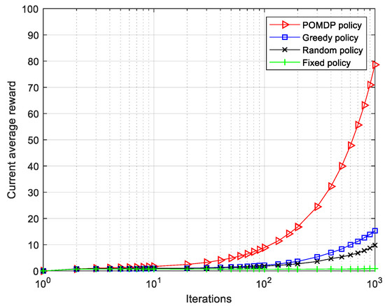 According to the principle of state transition, for the same anti-jamming action, the jamming score of the next state is not inferior to the current state. Anti-jamming effect after state transition will not be improved. After a multi-step transition of state, even the anti-jamming effect is negative. Thus, the long-term reward accumulation of fixed policy is the lowest. The reward of the random policy has strong randomness—each action has the same probability of being selected. The random policy has the lowest short-term reward, but the reward accumulation is higher than that of the fixed policy when the time step reaches about 550. The early-stage greedy policy rewards higher than the POMDP policy. The greedy policy only pays attention to the reward of the current time step, while the POMDP policy pays more attention to the long-term reward, so the former has a higher short-term reward, but at the end of the confrontation, the latter has the highest reward, as shown in Figure 11. In general, the action plan of the POMDP policy has the best anti-jamming effect.