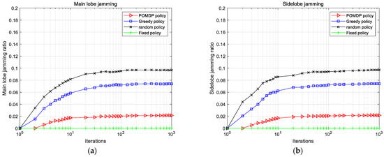 It can be seen that with the transition of states, the average occupancy of the jamming states of the four policies tends to be stable. Except for the fixed policy, the anti-jamming action set generated by the POMDP policy has the highest average occupancy rate for deception jamming, and the lowest average occupancy rate for main lobe jamming and sidelobe jamming. The random policy has the highest average occupancy rate for main lobe and sidelobe jamming, and the lowest average occupancy rate for noise jamming and impulse jamming. Only noise jamming and impulse jamming will occur with a fixed policy.