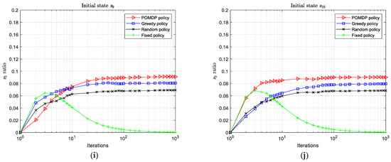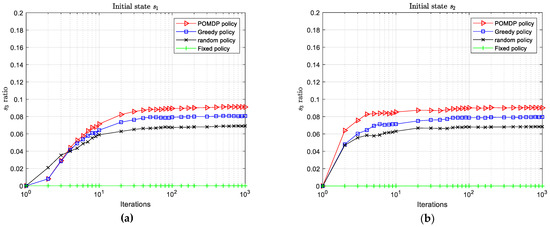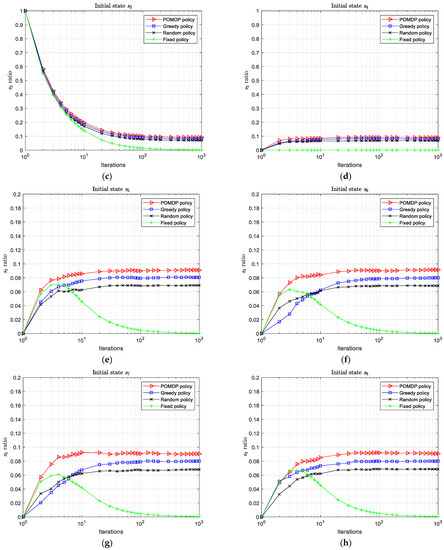 Parameter settings are as follows: discount factor , the initial belief state obeys a uniform distribution, and the SARSOP algorithm stops when the root gap reaches the expected gap ; the maximum time step .