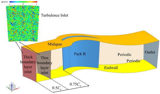 The computational domain contains a cascade channel, and the geometric model of the calculation is shown in Figure 1. The blade surface and endwall are adiabatic no-slip walls, and the thickness of the boundary layer at the leading edge of the cascade is controlled by adjusting the length of the no-slip wall surface at the inlet from the leading edge of the cascade. Constant velocity boundary conditions are adopted at the cascade inlet, the pressure boundary condition is adopted at the outlet, and the value is set as standard atmosphere pressure.