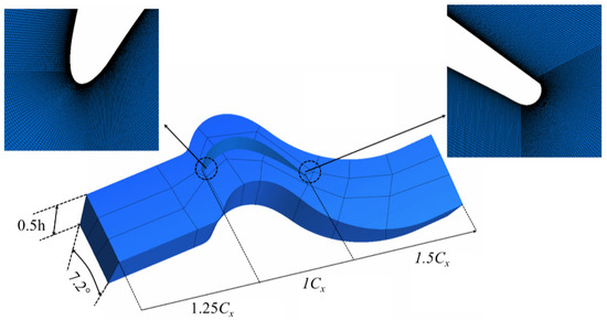 The topology of the cascade channel is shown in Figure 2, and the computational domain is divided into an “HOH” − type mesh topology; an “O” grid is used around the blade wall, and an “H” grid is used at the inlet and outlet of the cascade. The trailing edge of the blade is 1.5Cx away from the outlet of the computational domain, which is used to reduce the numerical reflection at the outlet position.