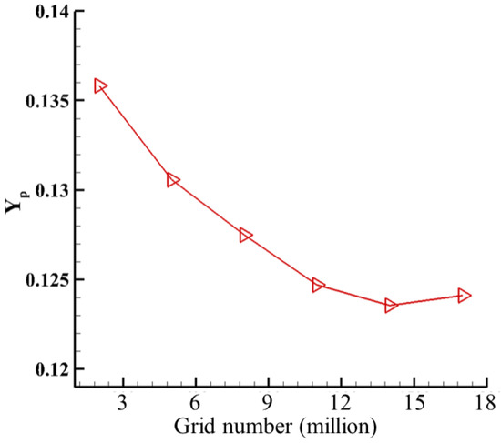 Figure 3 shows the verification results of grid independence calculated by different grid node numbers. When the number of grid nodes is below 12 million, the average loss calculation deviation of the outlet surface is large. The encryption strategy of the grid is not simply to increase the number of grid nodes, because this encryption strategy will result in ineffective encryption of the grid whose location is not affected by the secondary flow. Considering the simulation stability and cost, 15 million is finally selected as the grid number. The average export loss is defined as: