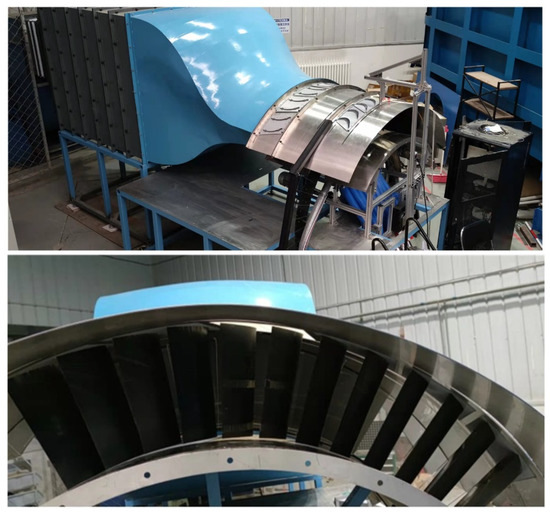 The endwall flow experiments in this study were performed in the low-speed fan-shaped turbine cascade laboratory of the Civil Aviation University of China. The structure of the cascade experimental bench is shown in Figure 4. The experimental bench is mainly composed of five parts: a centrifugal fan (air source), honeycomb section, rectification section, fan shrinkage section, and fan experimental section. The maximum working power of the fan can reach 55 kW, and the maximum air volume of the air source is 40,000 m3/h. The experimental section is mainly composed of an inlet guide vane and a static vane. The geometric scale of the fan-shaped cascade is consistent with that in Table 1, and the cascade consists of twelve blades. A series of static pressure holes are arranged at 5% and 40% of the blade height for static pressure data acquisition on the suction surface. Adjusting plates are arranged on the left and right sides of the cascade passage to ensure the uniformity of the inlet and periodicity of the outlet of the cascade passage, respectively. After adjustment, it can be ensured that the flow angle fluctuation at the inlet of the three blade passages is less than 0.5° and the static pressure fluctuation at the inlet of the blade is less than 1% of the dynamic pressure at the outlet. At the same time, the boundary layer thickness at the leading edge of the cascade can be changed by changing the casing and hub with different flow lengths.