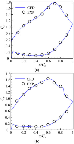where is the total pressure of the incoming flow, is the local static pressure, and is the outlet dynamic pressure. In Figure 7, by comparing the numerical values with the experimental results, it can be seen that the position of the pressure platform and the peak velocity point of the two are in good agreement, and the numerical results can better reflect the flow environment of the experimental blade.