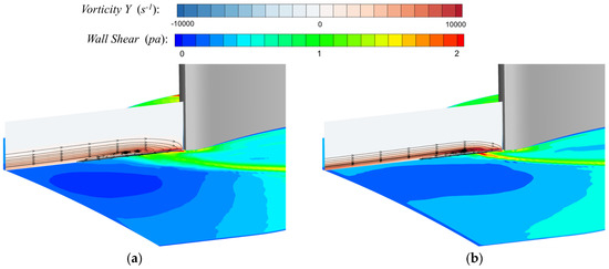 The time-averaged flow field analysis of the LES results at the location of Plane A in Figure 8 was selected, the endwall was colored using the time-averaged wall shear, and the results are shown in Figure 9. Since the thick boundary layer vortex system is more stable, the two vortices with close dimensions can be clearly distinguished by the time-averaged flow lines in Figure 9a. In Figure 9b, the vortex system is located closer to the leading edge of the blade in the flow direction, and only a larger vortex nucleus can be seen, which is close to the results of Baker et al. [42]. In Figure 9, both working conditions have clear positive and negative circular vorticity areas within the time-averaged flow field at the leading edge of the blade, and the positive vorticity area is approximately the same as the leading edge vortex system in the height range, while the negative vortex is concentrated at the bottom of the vortex system near the wall area. The average value of the positive and negative vortices in Figure 9b is larger than that in Figure 9a. The high wall shear region of the endwall is highly coincident with the leading edge vortex system as well as the HSV path [42], which can characterize the horseshoe vortex strength and action range. Compared to Figure 9b, Figure 9a has a larger endwall high wall shear region than Figure 9b due to the larger range of the vortex system. Because the vortex system is more stable, the instability phenomenon occurs less frequently, resulting in a smaller average amplitude in the high wall shear region of the endwall for the Figure 9a case than for the Figure 9b case.