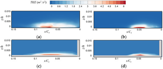 The time-averaged turbulent kinetic energy of the LES results at the location of Plane A and the turbulence measured by the hot-wire anemometer are given in Figure 10, with the horizontal coordinate being the distance from the leading edge of the blade and the vertical coordinate being the height from the endwall. In Figure 10, the high turbulence region at Plane A is captured both experimentally and numerically. The higher turbulent kinetic energy region is approximately the same as the range of the leading edge horseshoe vortex system, and the values are in good agreement with the experiment. The high-turbulence energy region in Figure 10a is larger than that in Figure 10b in terms of both spanwise and flow coverage. The difference in the spanwise direction is due to the different thicknesses of the boundary layer, and the difference in the flow direction is due to the flow direction migration of the vortex system. Compared with the thick boundary layer condition, the high turbulent energy region in the thin boundary layer condition is more concentrated and close to the leading edge of the blade and has a higher turbulent energy amplitude. In Figure 10, the CFD result has little difference from the experimental measurement results, therefore, it can be considered that the CFD result is reliable.