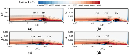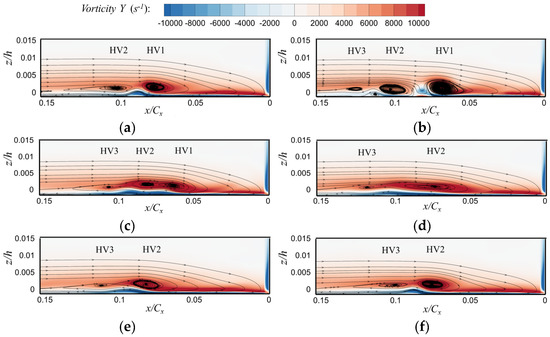 Figure 12 shows the typical vortex system flow pattern in thin boundary layer conditions. Figure 12a is similar to Figure 12a, and both represent the backflow mode. Similar to Figure 11b, Figure 12b is a zero-flow mode and is also composed of three vortices. In Figure 12c, HV1 and HV2 are fused, and HV3 is far away from the abovementioned two vortices, which does not show the phenomenon of close spacing or mutual fusion in Figure 11c. The thin boundary layer condition directly enters the next quasi-periodic cycle without the separation process of HV2 and HV3.
