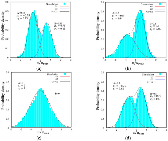 A and B [0, 1] and A + B = 1. A and B can be used to describe the percentage of the total calculation time for the mode; can represent the flow diversity or uncertainty of the flow field under the position. By comparing Figure 13a,d, it is found that at the same position with the same leaf height is very similar, indicating that it is affected by almost the same flow mode. The coefficient B of G2 in Figure 13d is larger than that in Figure 13a, which means that the zero-flow mode duration and the occupied energy are larger in the thin boundary layer case than in the thick boundary layer case. Moreover, the variance of both Gaussian distributions in Figure 13d is larger than that in Figure 13a. This shows that the two typical flow mode alternations are more frequent in the thin boundary layer case than in the thick boundary layer case during the full cycle.
