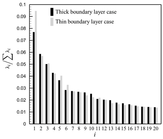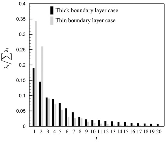 The energy share of each order mode of POD at Plane A is shown in Figure 14, where the vertical axis represents the proportion of energy of the mode flow field in the original flow field and the horizontal axis indicates the different modes. In the thick boundary layer case in Figure 14, the first six modes occupy 65% of the energy of the whole flow field, while the first four modes in the thin boundary layer case occupy more than 75% of the energy of the whole flow field. Thus, the abovementioned modes of the two cases are selected for analysis. In Figure 14, the energy of the thin boundary layer condition decays significantly faster than that of the thick boundary layer condition as the number of modes increases. This means that fewer modes occupy higher energy in the thin boundary layer condition, i.e., the thick boundary layer has a higher flow diversity and more flow patterns compared with the thin boundary layer.