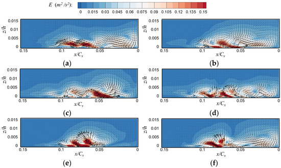 Figure 15 shows the velocity vector and energy distribution in the first six modes of the POD flow field under thick boundary layer conditions. In Figure 15, the velocity vectors in the first six modes with the highest POD energy can correspond to the structural changes of the six typical flow vortex systems shown in Figure 11. Additionally, the positions of the high energy area coincide with the near-wall reflux and secondary flow vortex systems shown in Figure 11. The Mode 1 flow field corresponds to the flow state in Figure 11a, the Mode 2 flow field corresponds to the process flow state between Figure 11a,b, and Modes 4 and 3 correspond to the flow states of near-wall backflow in different degrees of outburst instability process in Figure 11b. Mode 5 corresponds to the flow state when the vortex system is fused to form a large-size vortex structure in Figure 11d. Mode 6 corresponds to the flow state in Figure 11e, in which the flow state occurs when the large-size vortex structure forms and begins to separate. This implies that the six typical modes in Figure 11 occupy the majority of the energy in the flow field. The modes that contain the most energy in the calculation results of the thick boundary layer condition are Mode 1, which occupies 19% of the energy, and Modes 2, 3, and 4, which occupy 33% of the total energy. The abovementioned three modes correspond to the flow state in which instability occurs due to the outbreak of reflux near the wall and the zero-flow mode.