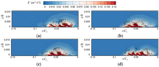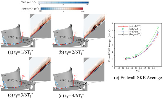 Figure 19 shows the calculation results of this method in the thick boundary layer condition, where SL and PL represent the fluid micromass track lines forming the suction and pressure surface branches of HSV, respectively. The time in Figure 19a–d is the initial moment when the fluid microclusters begin to move from the leading edge of the cascade. The instantaneous secondary flow energy amplitude when fluid microclusters move to different sections is shown in section cloud Figure 19 in the cascade channel. In the figure, a section is selected every 0.25Cx. The secondary kinetic energy at different sections is a time variable that can represent the instantaneous secondary flow intensity at this position. The enlarged contour image at the top shows the flow pattern at the leading edge under the initial time-cut flow pattern selected by the Lagrange transform. Figure 19a corresponds to the back-flow mode in Figure 11a, the zero-flow mode in Figure 11b, the flow state in which the vortex system begins to fuse in Figure 11c, and the flow state in which the vortex system merges to form a large vortex in Figure 19d. Among them, the SKE represented by the contour image in Figure 19b was significantly higher than that in Figure 19a,c,d. In the amplified flow field of Figure 19b, the near-wall reflux is in a state of outburst instability. Therefore, compared with the amplified flow field of Figure 19a,c,d, its HSV vortex system is more unstable, thus enhancing the secondary flow of the endwall.