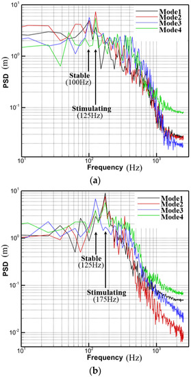 The power spectral densities of the eigenvectors of each order of the POD modes are shown in Figure 17, and different modes have different dominant frequencies. According to the description by Paik [16], the dominant frequency of each order mode is the characteristic frequency of the near-wall surface reflux state under the flow field of that mode. Thus, the dominant frequency of each order mode can characterize the stability of near-wall surface reflux. The dominant frequencies of the first four order modes in Figure 17 can be matched with the near-wall surface reflux stability and instability phenomena in Figure 11. Modes 2, 3, and 4 contain more energy in the bottom wall reflux, which indicates that they are stimulated to produce the instability mechanism. Therefore, the dominant frequency of 125 Hz represents the near-wall reflux instability frequency. For the thin boundary layer condition, the POD calculation results also capture the dominant frequencies of near-wall reflux stability and instability, where the near-wall reflux in Modes 1, 2, and 4 flow fields is in the state of instability. Therefore, its dominant frequency is the main frequency of near-wall reflux stimulation, i.e., 175 Hz, while the near-wall reflux in the Mode 3 flow field is more stable, and its dominant frequency is the back-flow mode frequency of 125 Hz.
