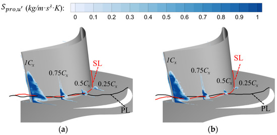 The time-averaged entropy generation characterizes the viscous losses of the time-averaged flow field in the non-pressurizable flow, which does not take into account the entropy gain from velocity fluctuations, i.e., it does not include the losses due to unsteady effects. Figure 20 shows the Q-criterion isogram within the cascade channel, colored using the fluctuating entropy generation [46]. In Figure 20a, the initial secondary flow intensity is higher compared to Figure 20 due to its larger vortex size and higher intensity, which in turn causes greater unsteady losses in the first half of the cascade channel. However, the vortex system is relatively stable, and the vortex fluctuation is weak. As the flow progresses downstream, the unsteady effect of Figure 20 gradually accumulates, and the unsteady loss in the channel gradually exceeds that of Figure 20. The difference between the time-averaged entropy generation of the two conditions is small, the thick boundary layer condition is slightly larger than the thin boundary layer condition, and the two conditions have large differences in fluctuating entropy generation.