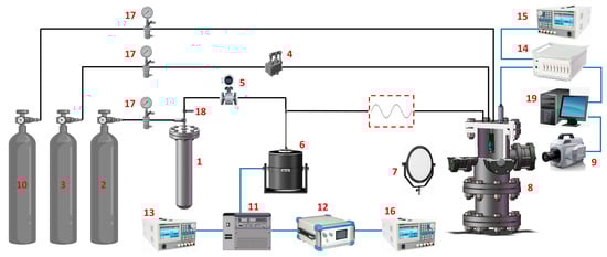 Experimental facilities and setup: 1—working medium storage tank; 2, 3, 10—high-pressure nitrogen tank; 4—gas flow controller; 5—liquid flow meter; 6—flow pulsation generator; 7—LED lamp; 8—backpressure chamber; 9—high-speed camera; 11—power amplifier; 12—signal generator; 13, 15, 16—DC power supply; 14—data acquisitor; 17—relief valve; 18—stop valve; 19—computer.