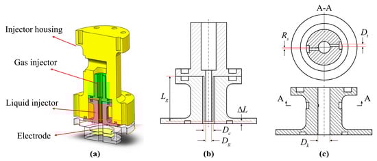 Schematic of GCSC injector: (a) assembly diagram with measurement electrodes; (b) gas injector; (c) liquid injector.