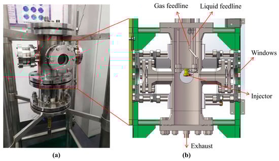 The core equipment of the backpressure environment system is the backpressure chamber that is shown in Figure 3. The material of this backpressure chamber is 0Cr18Ni9 (austenitic stainless steel). It has a height of 726 mm and an inner diameter of 154 mm. The maximum ambient pressure that this chamber can withstand is 3 MPa, and the backpressure fluctuation range is ±5%. It has three optical observation windows in two perpendicular directions, which have gas purge functions. A regulator valve is installed at the bottom for regulating the chamber pressure and exhausting. It can provide backpressure experimental conditions for gas and liquid multi-component injectors.