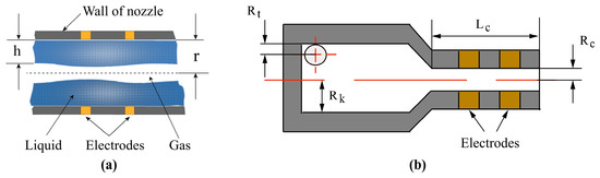 The flow pulsation of liquid at injector outlet manifests as the change of annular liquid film thickness, whereas the liquid film thickness can be measured via the electric conductivity of liquid between two electrodes in injector chamber. Therefore, the purpose is to calibrate the relation between the voltage of two electrodes and the liquid film thickness. The measurement principle of the electric conductance method (ECM) is elaborated by taking an example of an LS injector with a simple structure. The schematic and structure parameters of LS injector are shown in Figure 5 and Table 3, respectively. Two ring electrodes composed of porous titanium are placed near the outlet of LS injector. The conductivity between the two electrodes varies with the liquid film thickness. The expression of the resistance of annular liquid column is