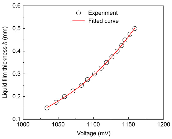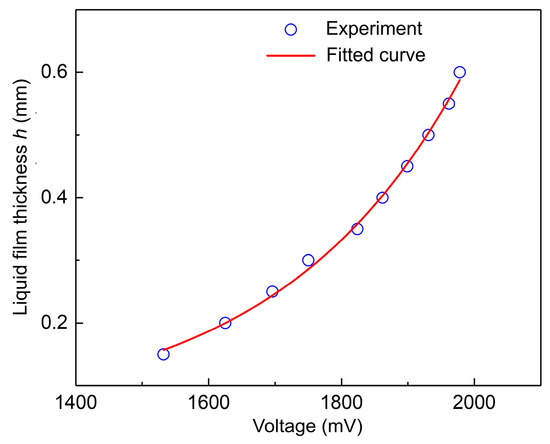 Cylindrical ceramic rods of different diameters were placed in the swirl chamber to calibrate the measuring system of liquid film thickness. When the liquid flowed through the swirl chamber, liquid films of different thicknesses were generated in the annular space between the inner wall of injector and the ceramic rods of different diameters. By recording the corresponding voltage signal value, the calibration curve of liquid film thickness and voltage could be obtained as drawn in Figure 6. The same measurement principle of liquid film thickness and the installation method of electrodes were also adopted for the experiment of the dynamic characteristics of GCSC injectors.