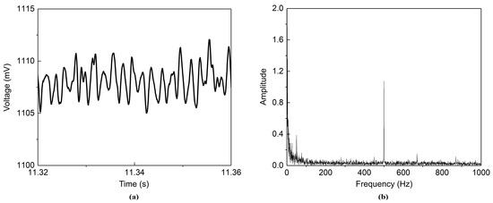 The small fluctuations of liquid film thickness in injector and the considerable noise associated with the flow process make it difficult to measure the conductivity of the liquid column between the electrodes. In order to solve this problem, a homemade liquid film thickness sensor based on a lock-in amplifier circuit was used, which can meet the requirements of liquid film thickness acquisition at frequency up to 500 Hz. The raw data of the measured liquid film thickness are shown in Figure 7.