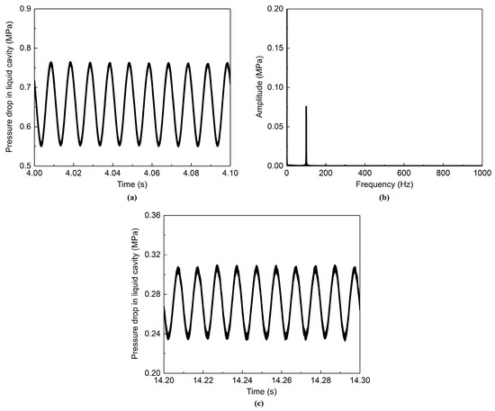 Considering that the frequency of the dynamic characteristics of the injector is 10–1000 Hz, and the pressure amplitude is 103–2 × 106 Pa, a high-frequency dynamic transducer was chosen to measure the pressure in the liquid cavity of the injector. The accuracy of this transducer is 0.5% and the range is 0–4 MPa. A power amplifier was used to amplify the pulsation signal generated by the signal generator, which drives the flow pulsation generator to excitation and meet its frequency range (5–2000 Hz). The data acquisitor adopted a dynamic signal test and analysis system (DH5922D, Donghua Calibration & Testing Co., Taizhou, China) with a sampling frequency of 256 Hz. The system can simultaneously perform 16 signal acquisitions, convert digital–analog signals, and transfer the acquired real-time signals to a computer.