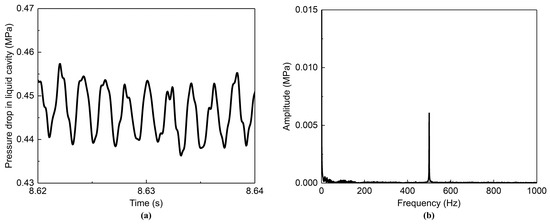In the experiments that simulate the spray process of real rocket engines, it is difficult to produce high-frequency pulsations in supply pressure [30]. This is because the increase in frequency makes it difficult for the flow pulsation generator to generate pressure pulsation of incoming flow at high backpressure. The inertial flow pulsator is based on mechanical vibrations causing the pulsation of the pipeline flow. Considering the influence of mechanical vibration on the stable operation of the whole experimental system, the inlet and outlet of the inertial flow pulsator are connected with the main feedline by means of a metal hose. In this way, the vertical displacement of the oscillation tube can be matched to buffer the influence of the system pipeline oscillation on the pulsation signal of the liquid pressure in the tube. Using this inertial flow pulsator, high-frequency pressure pulsations can be generated in a high backpressure environment. The pressure pulsation at 500 Hz from the pulse exciter, after passing through the feedline, causes a pressure signal in the liquid cavity of LS injector as shown in Figure 9. It can be seen that this inertia flow pulsator can still cause a regular pulsation of the incoming flow at a higher frequency.