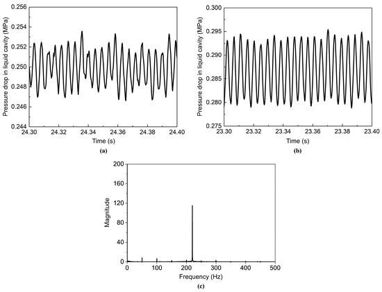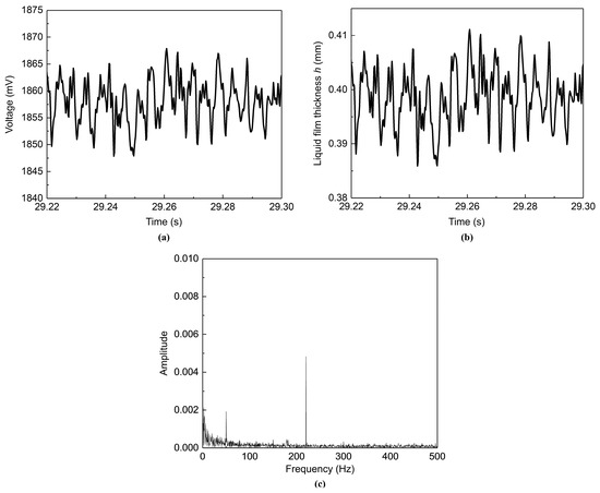 After acquiring the steady-state spray data of the GCSC injector, the dynamic characteristics of the spraying are investigated by turning on the inertial flow pulsator. The raw data (i.e., voltage) of the liquid film pulsation are measured using the liquid film thickness sensor. The liquid film thickness at the GCSC injector outlet is calibrated using a method similar to that in Section 2.3.2. As shown in Figure 13, the raw voltage signal of liquid film is converted into the liquid film thickness value. Accordingly, it is possible to convert a series of raw voltage signals measured by a liquid film thickness sensor into a dynamic value of liquid film thickness over time, as shown in Figure 14. Based on the processing results of the Fourier transform (Figure 14c), it is found that the main frequency of the pulsating signal of liquid film thickness was 220 Hz, which is consistent with the pulsation frequency outputted by the signal generator.