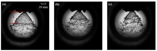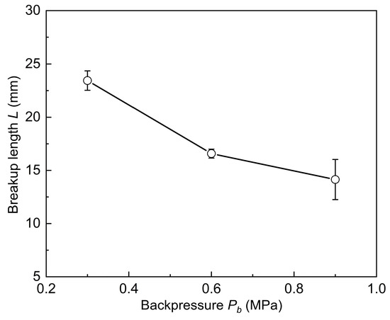 To capture the details of the spray field, the spray field was photographed using a high-speed camera with a sampling frequency of 20,000 frames per second. The resulting instantaneous spray patterns under different chamber backpressures Pb are shown in Figure 11. Several possible criteria for the breakup length are defined in the literature. In this study, the spray breakup length was defined as the vertical distance from the injector exit to the first point where the liquid sheet started to break up into liquid filaments. The breakup length was obtained using 20 images from the backlighting photography. Additionally, the error bars were obtained from the measurement uncertainty of 20 samples, which were analyzed by solving the sample standard deviation. Figure 12 shows the effect of chamber backpressure on the spray breakup length L.