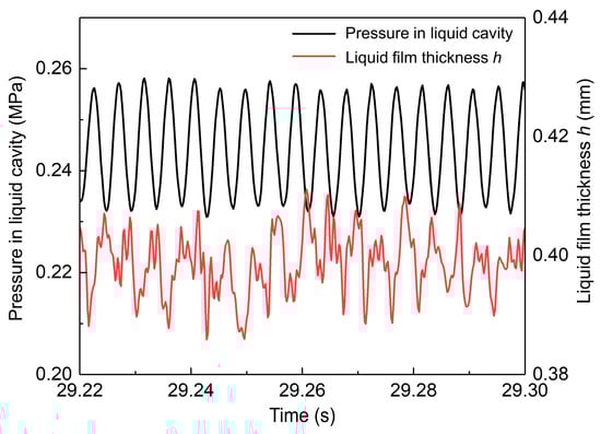 Pulsation curves of the pressure in liquid cavity and the liquid film thickness when = 220 Hz.