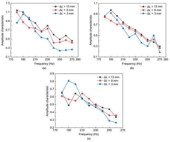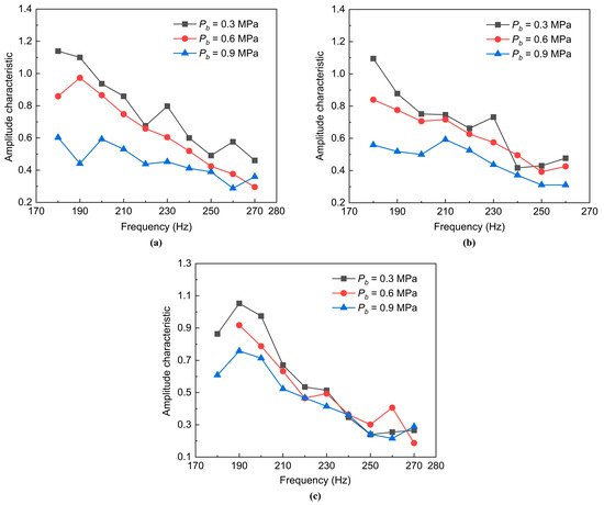 Using the similar approach in Section 3.3, the effect of the recess length of the GCSC injectors on the dynamic characteristics of spraying can be obtained under different chamber backpressure conditions. Figure 19 shows the effect of various recess lengths on the dynamic characteristics of the GCSC injectors in the pulsation frequency ranges of 180–270 Hz. It can be seen from the figures that for lower backpressure conditions, as the recess length increases, the amplitude–frequency characteristics of the injector generally increase. This is because when the recess section of the GCSC injector becomes longer, the gas from the outlet of the gas injector will enhance the impact effect in the recess section, to tear the liquid film inside the injector tempestuously. This leads to an increase in the oscillation of the liquid flow at the injector outlet, which in turn increases the amplitude–frequency characteristics of the spraying for the injector.