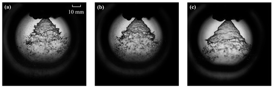 Spray patterns of the GCSC injectors under different chamber backpressures: (a) = 0.3 MPa; (b) = 0.6 MPa; (c) = 0.9 MPa.