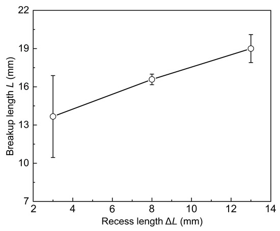where is the disturbance amplitude of the liquid sheet at the injector exit; is the initial disturbance amplitude inside the recess section; is the disturbance wave number; is the recess length of the swirl coaxial injector. In these experiments about the effect of the recess length, the operating conditions, such as the pressure drop, the gas flow rate, and the chamber backpressure, were fixed. Additionally, the initial disturbance amplitude of the liquid sheet inside the recess section was constant. However, the disturbance amplitude of the liquid sheet at the injector exit would be different with the changed recess length . From Equation (9), the disturbance amplitude of the liquid sheet decreases as the recess length increases. This decreased disturbance amplitude increases the breakup length L of the liquid sheet according to the theory of Clark and Dombrowski [37], as shown in the following equation:
