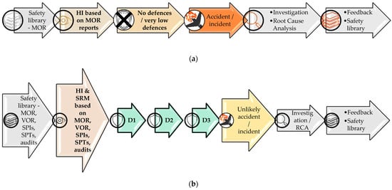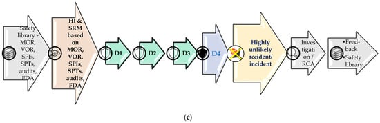 Figure 3 shows processes of reactive, proactive, and predictive safety management methodology in the current form. All three methodologies are closely linked to every element of the ICAO framework, but their most important role is within the element of hazard identification, where they act as a tool to acquire necessary data to identify hazards []. Reactive methodology (Figure 3a) gathers data from previous accidents and incidents and learns from their outcomes by establishing causes of the accident or incident (RCA—Root Cause Analysis). Proactive methodology (Figure 3b) uses safety reporting systems and safety performance indicators/targets to gather safety information continuously, to detect and mitigate the potential threats that may consequently trigger the occurrence of accident or incident. Proactive methodology extended safety data input sources and introduced so-called “defenses”, (D1, D2, D3 in the figure) representing regulations, technology, and training, respectively. As already mentioned, predictive methodology (Figure 3c) is not yet well established, as it assumes the detection of future hazards based on predictive analyses (forecasts). Current predictive methodology implies the use of real-time monitoring and analysis systems (e.g., FDA), which extends previous proactive methodology, and introduces another defense layer to the system (D4 in the figure).