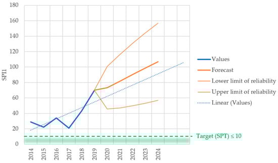 Table 2 and Figure 5 show one example of forecasting safety performance indicator behavior (SPI1—Total number of reported occurrences/hazards) in the terms of incline/decline of its values in the future period 2020–2024 based on historical safety data of the organization in the period 2014–2019. The deviation from target area is also shown in the figure (marked green). The predictive method used for this example is called Simple Moving Average (SMA). All other examples of forecasting safety performance indicators can be found in Appendix C.
