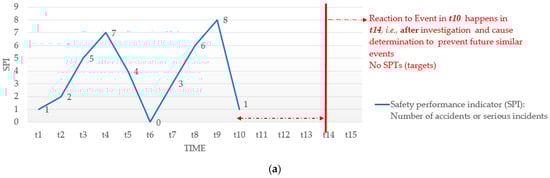 Safety performance indicator (SPI) behavior in different safety management environments: (a) safety performance indicator (SPI) in reactive safety management; (b) safety performance indicator (SPI) in proactive safety management; (c) safety performance indicator (SPI) in predictive safety management [].