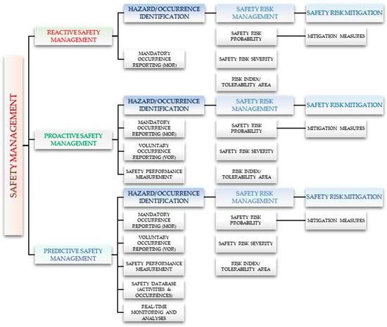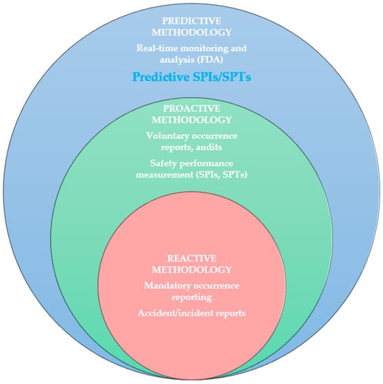 It can be observed (Figure 7) that each methodology of safety management is different in the step of identifying hazards. Every defined safety management methodology needs and uses safety (input) data collected from various sources. The reactive methodology uses safety data from mandatory occurrence reporting (accident/incident reports). Proactive methodology collects data from mandatory and voluntary occurrence reports, and safety audits and safety performance measurement (establishment of SPIs and SPTs). Predictive methodology gathers and uses data from mandatory/voluntary occurrence reports, safety performance measurements (SPIs and SPTs) and data obtained from real-time monitoring systems (e.g., FDA) that extract information from historical and current safety data to predict trends and behavior patterns of upcoming hazards. Hence, safety data obtained from various sources represent the correlation between the three methodologies of safety management. It is also observed that proactive methodology acts as an upgrade for reactive methodology, while predictive methodology acts as an upgrade for proactive methodology.