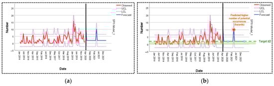 The initial forecast of safety performance indicators SPI1—Total number of recorded occurrences for the period April 2020—March 2022: (a) Initial forecast of safety performance indicators SPI1; (b) Initial forecast of safety performance indicators SPI1 with set safety performance target (SPT) and its breaches [,].