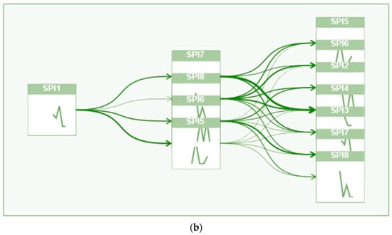 Two case scenarios were created by using an IBM SPSS Statistics function, “Apply Temporal Causal Model”, function “Run Scenarios” and top causal factors for SPI1 (e.g., OI3 and OI9), which revealed how OI3 and OI9 affect SPI1 (Figure 15) [,].
