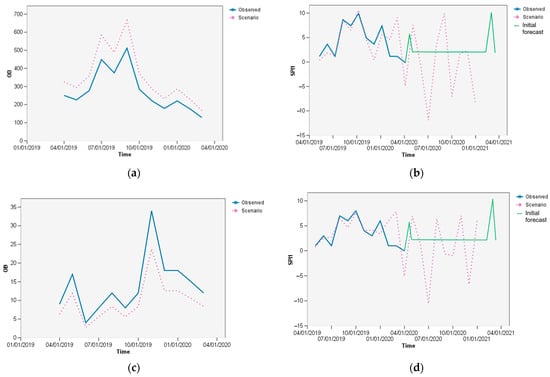 Figure 15a shows two series of organizational indicator OI3. The blue one is showing observed (initial) values from April 2019 until March 2020. The pink one shows scenario-adjusted values (initial ones increased by 30%) in the same period. Figure 15b shows two series of safety performance indicators SPI1. The blue one is showing observed (initial) values from April 2019 until March 2020. The pink one shows scenario-adjusted values due to the application of causal model links and the increase of OI3. It also shows scenario-forecasted values. It can be observed how scenario SPI1 had changed behavior due to increase of OI3, and, in comparison with initial forecast (green curve) of SPI1 (Figure 10). Figure 15c shows two series of organizational indicator OI9. The blue one shows observed (initial) values from April 2019 until March 2020. The pink one shows scenario-adjusted values (initial ones decreased by 30%) in the same period. Figure 15d shows two series of safety performance indicators SPI1. The blue one shows observed (initial) values from April 2019 until March 2020. The pink one shows scenario-adjusted values due to the application of causal model links and the decrease of OI9. It also shows scenario-forecasted values. It can be observed how scenario SPI1 had changed behavior as well, due to decrease of OI9, and, in comparison with initial forecast (green curve) of SPI1 (Figure 10) [,].