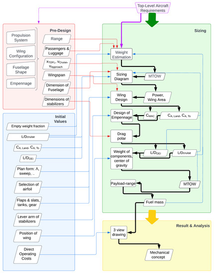 The design process is described in Figure 1. In a first step, assumptions about the propulsion system, the wing configuration, the fuselage shape and the empennage were applied in the pre-design (red box). With these assumptions, preliminary values were defined for the range, passenger and luggage weight, runway take-off length, cruise and landing speed and wingspan. Having these pre-design values, as well as the initial values (blue box) set, the sizing process (green box) began with the weight estimation according to Roskam [14].