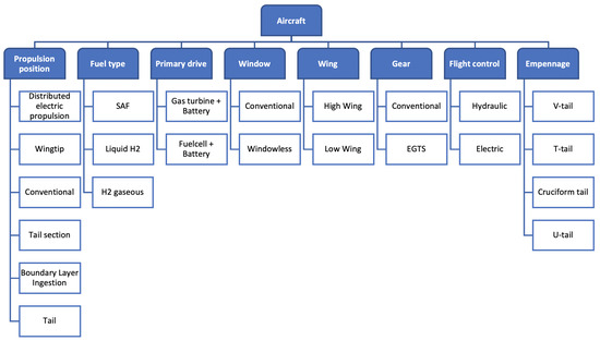 Through a preliminary evaluation process in compliance with the given TLAR [5], some design possibilities were excluded. The remaining design possibilities are shown in Figure 2. In this assessment, the design possibilities were evaluated by performance, environment and economics as well as operational aspects. Since the focus of this work lies in the basic design of the aircraft, no detailed analyses of the individual structures and aerodynamics were performed. Nevertheless, this work is based on scientific evidence by using estimation formulas for the design according to reliable sources [11,14,17,18]. The aim of the configuration selection is to identify a performing concept and to place the performance in relation to the reference aircraft. In the following sections, the reasoning behind every decision is explained.