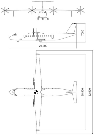 The individual component masses were calculated by semi-empirical equations, which were derived by Torenbeek [11]. To start the iterative calculations, first, assumptions were made with the existing data of the reference aircraft [40]. The propulsion concept eliminates the conventional turboprops; therefore, the mass of the electric motors, including cabling, is calculated by linear scaling using the required power [41]. Electric motors are scalable and adjustable within the required power [42].