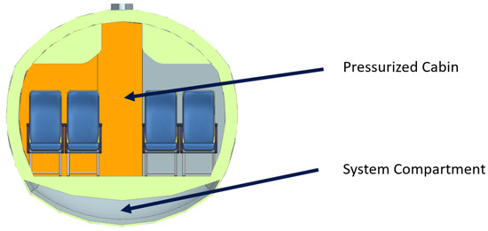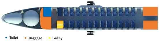 There are multiple approaches to maximizing cabin space; however, it is essential to weigh the balance between passenger comfort and space utilization in the design process [30]. With a market analysis, the current state of the art in cabin layout can be analyzed as well as new concepts, such as a windowless fuselage [31]. Nevertheless, the urgency for a regional aircraft design preferring passenger comfort over the use of space is not relevant. The major change to the fuselage is the integration of the fuel tanks, which is covered in more detail in Section 2.3.3.
