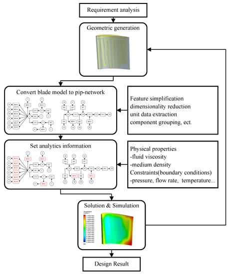 As shown in Figure 1, it is the diagram of the blade’s PNC. The blade’s 3D geometric model is first abstracted into the 1D fluid network. The blade’s preliminary pipe-network diagram is formed through feature simplification, dimensionality reduction, flow unit data extraction and component grouping, etc. Then, the analytics information of the blade’s pipe-network, such as physical properties and boundary conditions, is set. Lastly, the temperature field information of the blade is obtained by solving the continuity control equation. The design results of the blade are obtained.