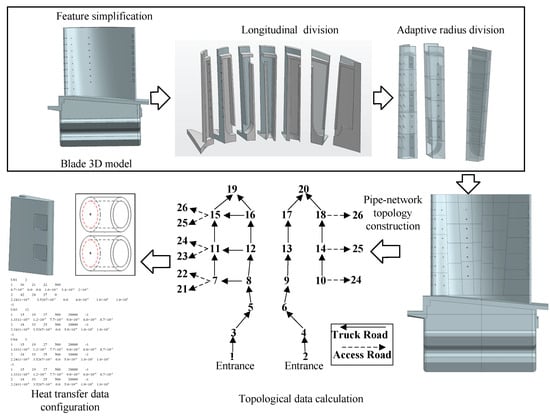 Firstly, some blade models’ features, which do not affect the constructed pipe-network, are suppressed. A simplified blade model is obtained. Then, the blade is decomposed into geometric throttle units containing specific cooling structures using longitudinal division and adaptive radius division decomposition. Finally, the geometric flowing unit is abstracted and mapped to functional elements and computing nodes in the pipe-network diagram.