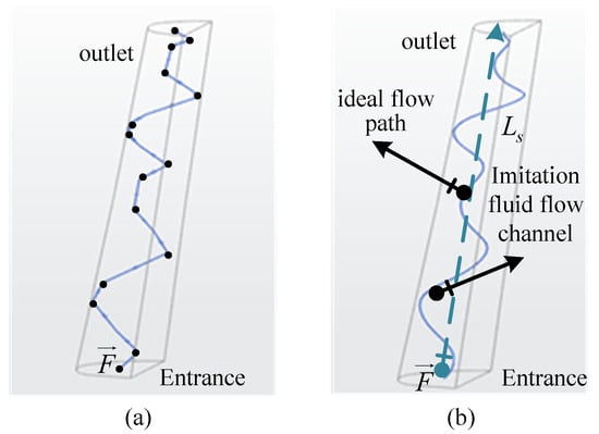 After meeting the backflow judgment criteria, a set of polyline segments from the inlet to the outlet can be obtained (Figure 5a), Then, the endpoints of all polylines are used as control vertices, and the cubic spline fitting is performed according to the equal chord parameter method to obtain the initial reference flow path topology skeleton line (Figure 5b). Compared with the ideal flow path under manual identification, the topological skeleton line of the flow path imitating the fluid flow is correct, but the bending and twisting are too much, which will affect the segmentation and spatial arrangement of the subsequent flow units.