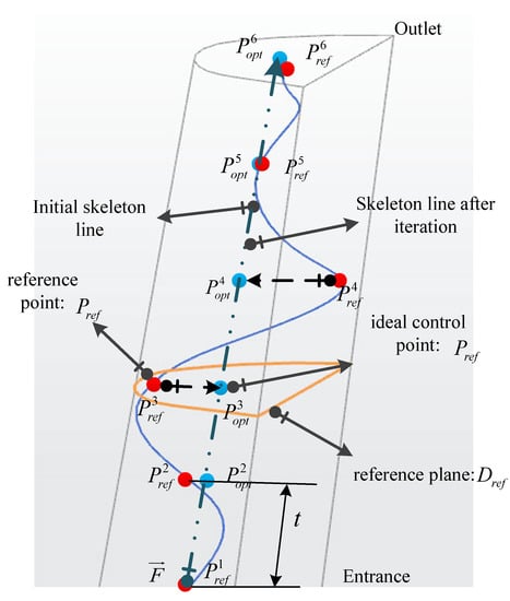 The purpose of iterative optimization is to smooth the original skeleton line and centralize the flow path under the premise of ensuring the correct direction of the original skeleton line, which mainly involves the calculation accuracy of the center point and the ideal space distance of the center point. In the first case, due to the too-large inclination of the reference plane, the center point will be offset too far from the reference point. The skeleton line generated by such a center point is more twisted than the initial skeleton line, which does not meet the requirements of iterative optimization, as shown in Figure 7b. In the second case, the main purpose is mainly to reduce the number of iterations. The maximum offset distance D is set to . R is the equivalent radius R of the reference plane. If the distance between the center point and the initial reference point is less than D, the initial reference point is retained, otherwise, the original reference point is replaced.
