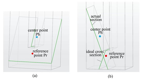 The main function is to exclude the concave polygon ring to construct a reasonable center point. When the flow channel turns, a concave polygonal section closed loop as shown in Figure 7a will appear. The center point obtained through the section loop will be located outside the flow channel solid model. The criteria for judging the concave–convexity of the central section are to avoid the occurrence of the above situation. Concave polygon rings are screened out, while only convex rings are left. Concave and convex judgment method: By connecting the line elements in the closed-loop of the section end to end, the vertex set of the topological polygon of the section can be obtained. It can be judged according to the edge-vector cross-product of the adjacent edge constructed by the vertex of the cross-section topology polygon. If the direction of the edge-vector cross-product is the same, it means that the polygon is convex and meets the conditions; otherwise, it is a concave polygon.