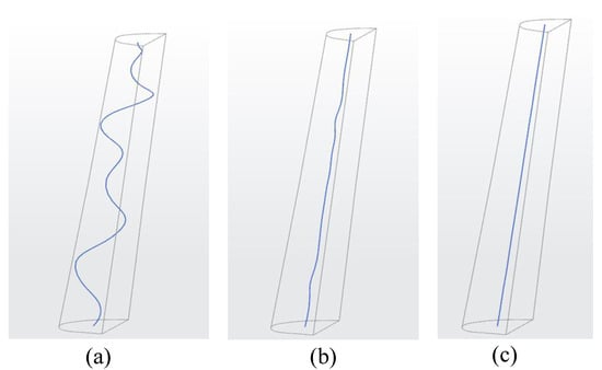 Iterative optimization results of the single-channel flow path skeleton line: (a) Original flow path skeleton line; (b) Skeleton line obtained by one iteration; (c) Final optimized skeleton line.